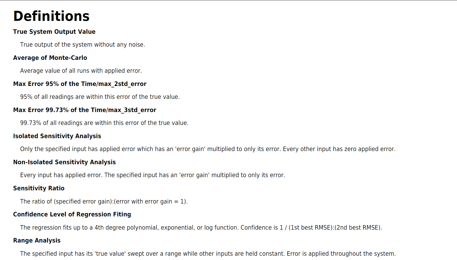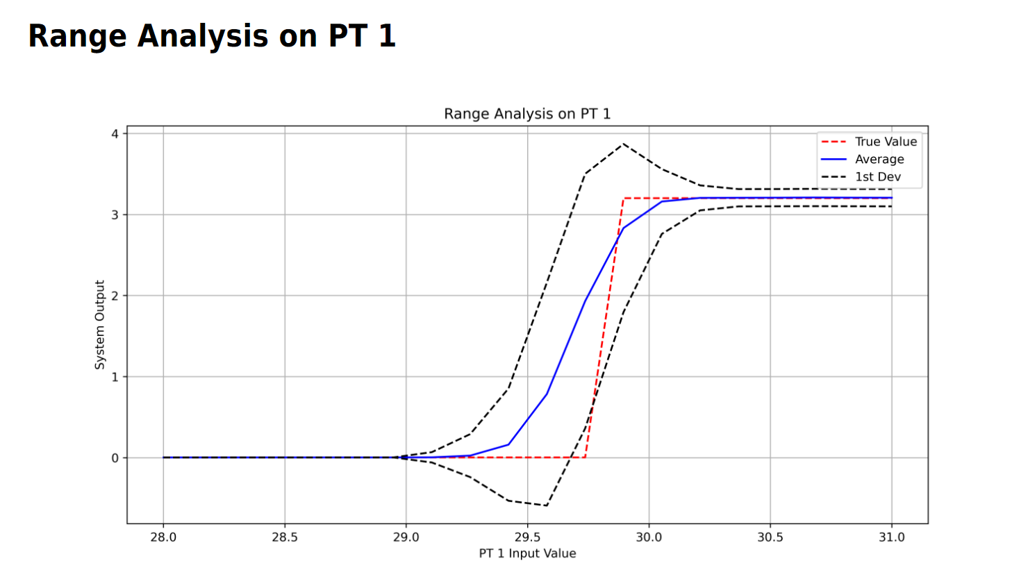 Similar to sensitivity analysis, range analysis is optional. For each sensor that undergoes range analysis, there is only one plot. This plot sweeps over the possible values that the sensor could have read, giving the user an idea of the error as a function of that sensor's reading. This is primarily impactful for the DensityLookup function.
