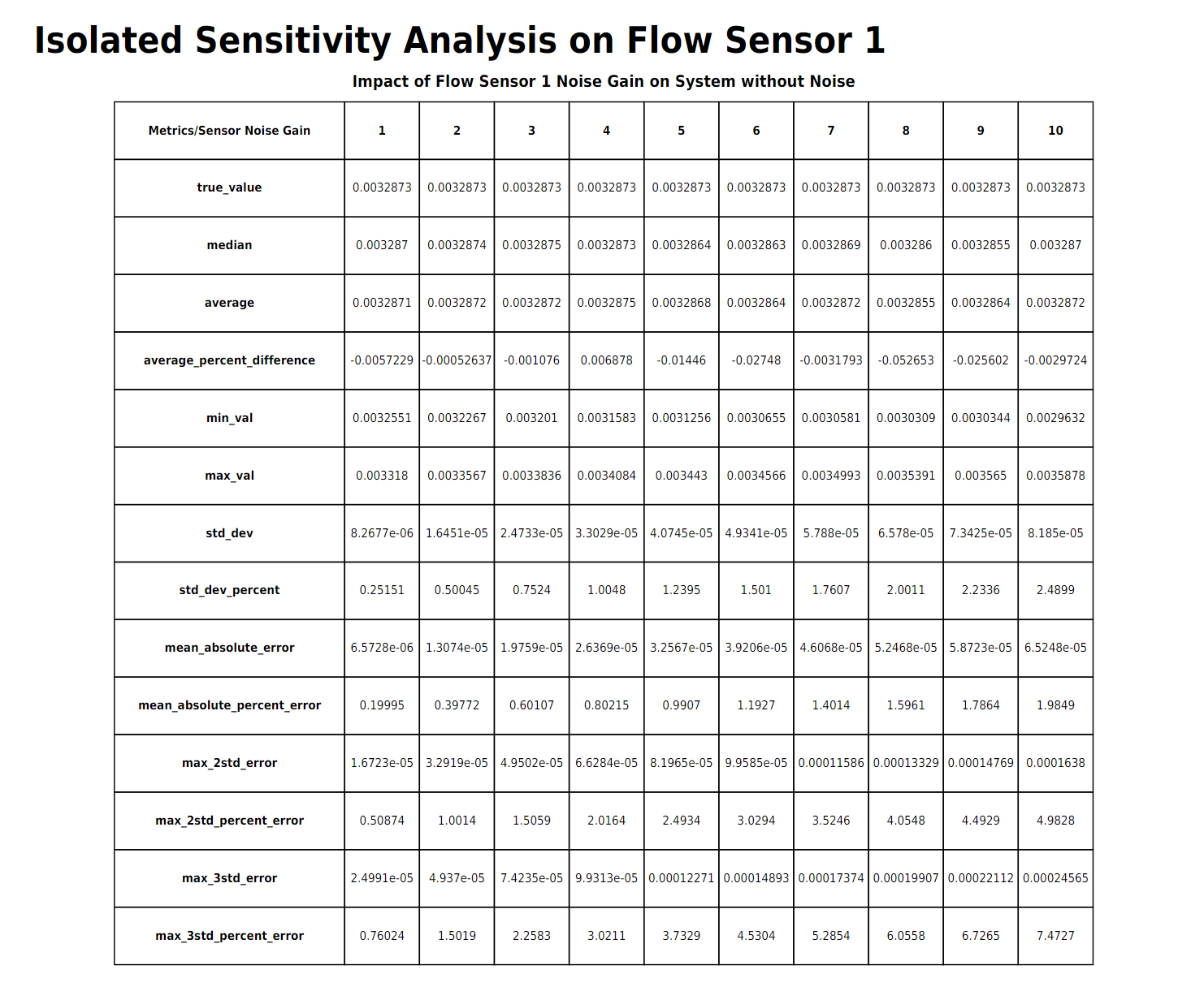 Continuing with sensitivity analysis, the next table and sets of plots are "non-isolated", meaning the rest of the sensors will have their standard error applied while the sensor under analysis has an "error gain" applied to its base error.