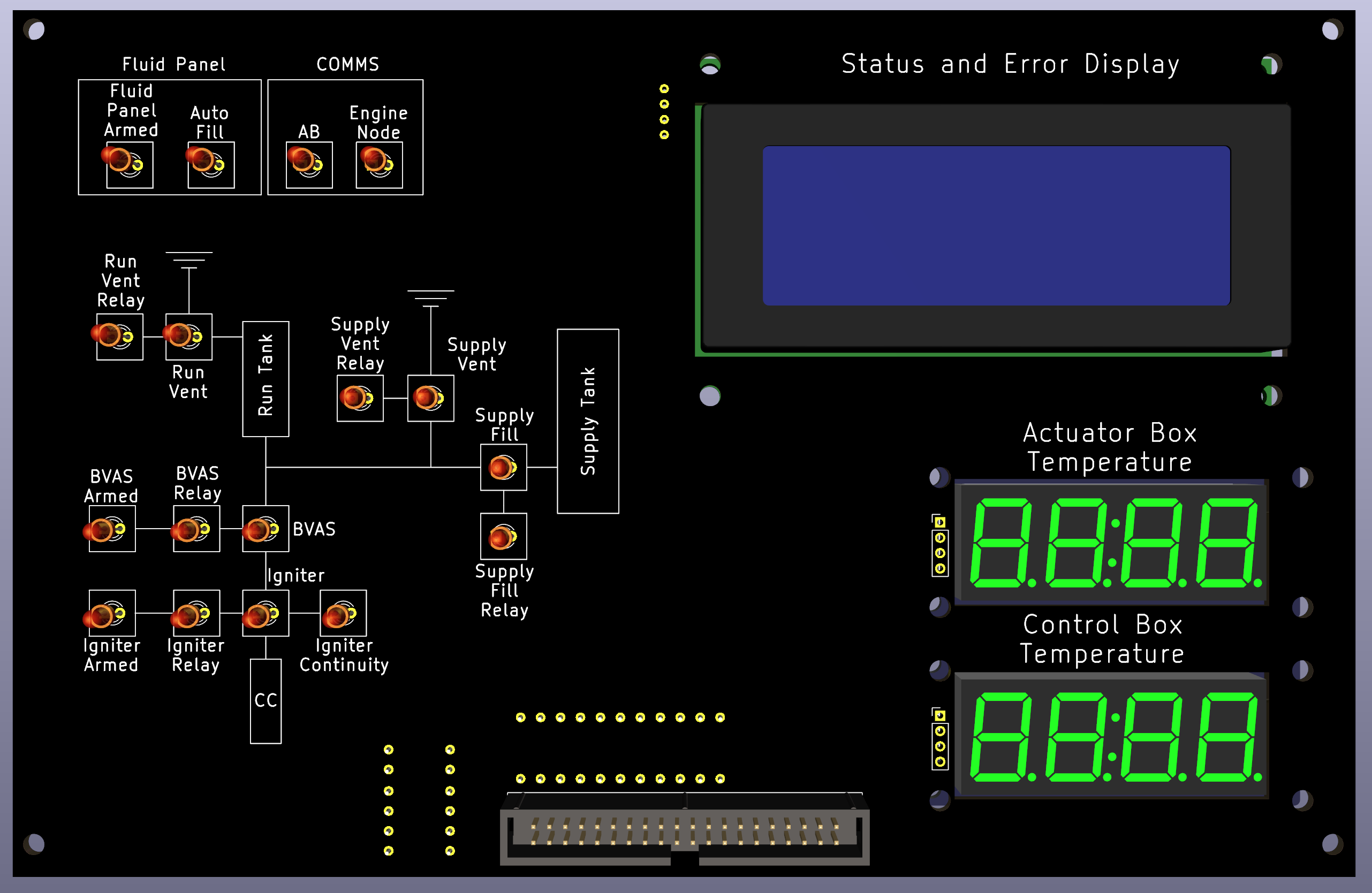 The control box is responsible for taking in operator inputs and sending them to the actuator box over CAN. The control box also receives feedback from the actuator box and updates the assortment of LEDs and the LCD screen on the indicator panel.